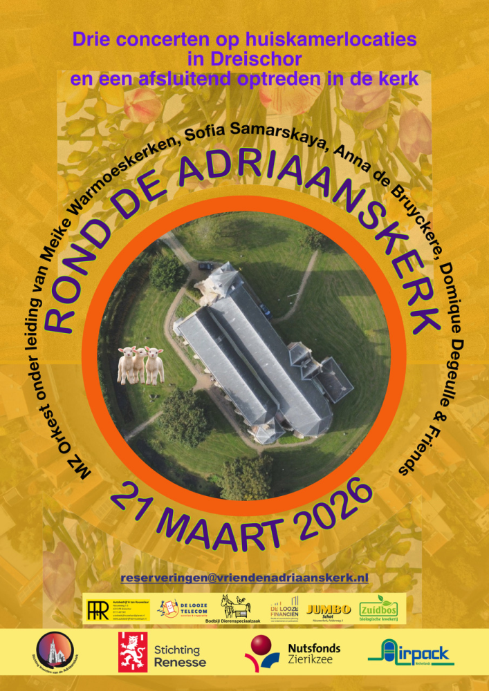 21 maart vieren de Vrienden van de Adriaanskerk de lente met een avond vol muziek, theater en poëzie op huiskamerlocaties rond de Adriaanskerk in Dreischor. Afsluitend is er een concert in de kerk. Voor de liefhebber serveren we vooraf een heerlijke curry-maaltijd (á 5 euro). De artiesten die optreden hebben allen Zeeuwse wortels. Te zien en te horen zijn het MZ Orkest onder leiding van Meike Warmoeskerken, singer-songwriter Sofia Samarskaya, theatermaker Anne de Bruyckere en retrorocker Dominique Degeulle & Friends. |